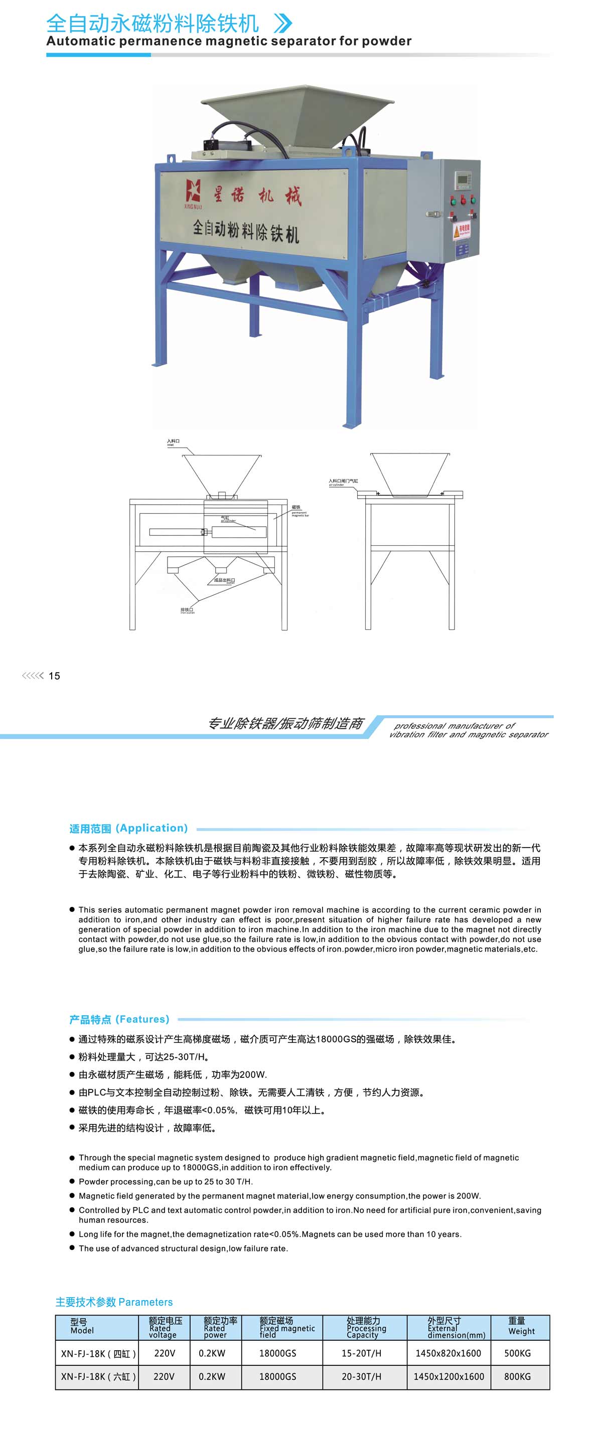 Application | This series automatic permanent magnet powder iron removal machine is according to the current ceramic powder in addition to iron,and other industry can effect is poor,present situation of higher failure rate has developed a new generation of special powder in addition to iron machine.In addition to the iron machine due to the magnet not directly contact with powder,do not use glue,so the failure rate is low,in addition to the obvious contact with powder,do not use glue,so the failure rate is low,in addition to the obvious effects of iron.powder,micro iron powder,magnetic materials,etc. |